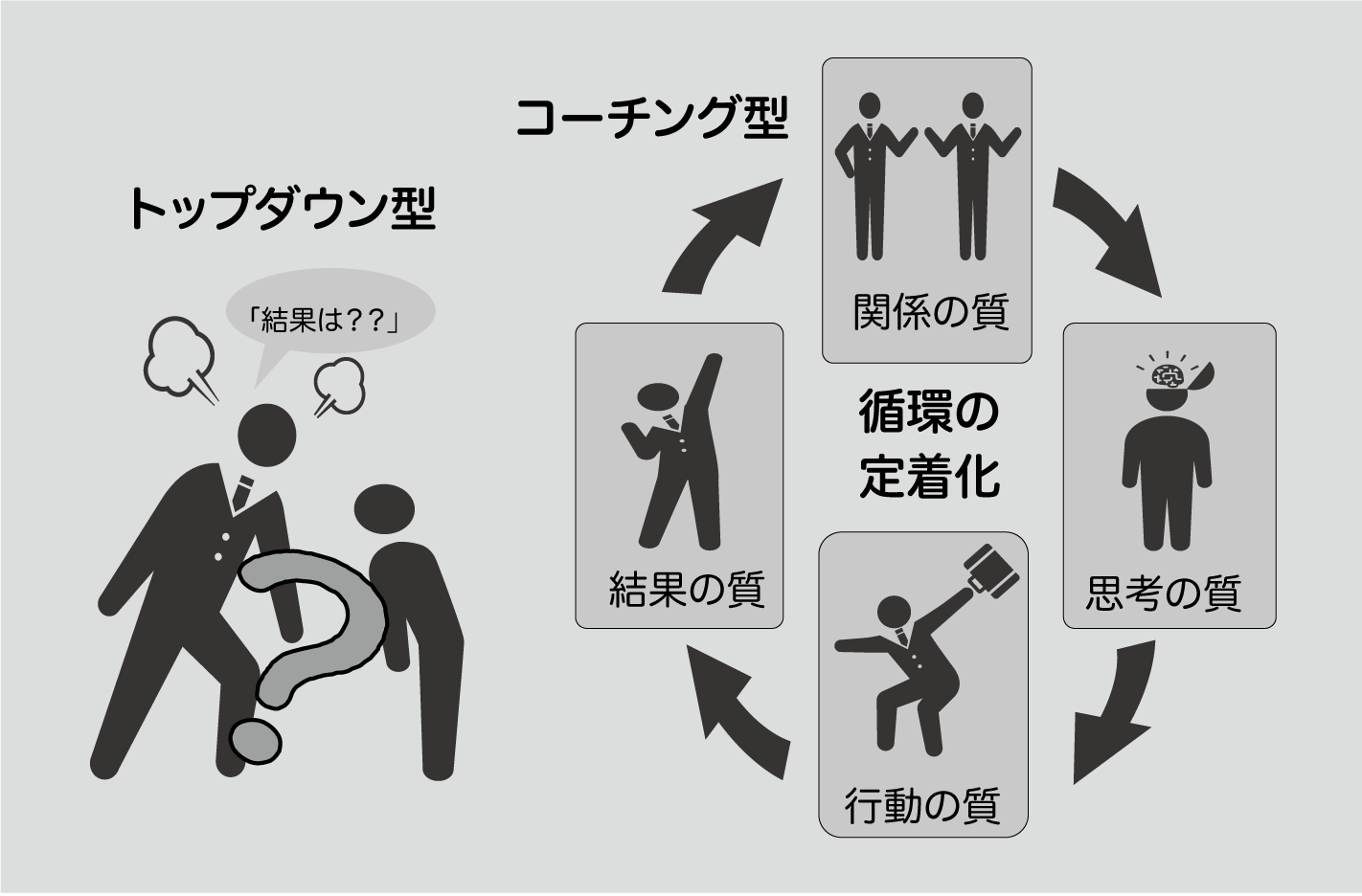 弊社では経営者様に人・組織に関する悩みをヒアリングして、人・組織の課題解決の一定期間のゴールを定めながら、信頼し対話ができる「関係の質」→内省し考えることができる「思考の質」→自ら自律的に行動できる「行動の質」→目標の成果が上がる「結果の質」の循環が定着できるよう経営者様と一緒に取り組んでサポートしていきます。